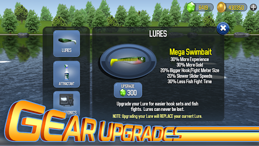 Upgrade your lures to increase the chances of catching that monster Bass. You'll fish with crankbaits, spinnerbaits, spoons, and plastics!