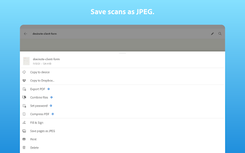 • Save each scan to Adobe Document Cloud for instant access and sharing.