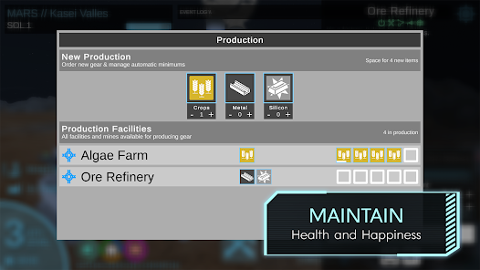 As your city grows you’ll need to balance resource production with the needs of the growing community. You will need to plan ahead and figure out how to provide things to your settlers that are taken for granted on Earth. Closely monitor your cities resources like oxygen, water and food to ensure your citizens are healthy and that your city can continue to thrive.
