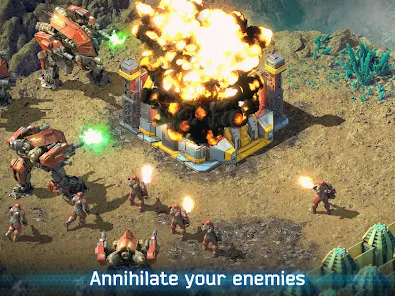 Using the troops you build you can attack enemy bases to steal their resources an earn XP. Make sure you build a variety of different troops to take on the enemy walls, defences and structures. For example, standard foot soldiers can soak up damage whereas grenadiers need cover and are perfect for shooting at defence turrets. Continue to upgrade your buildings, gather resources and create an impressive and varied army. Can you conquer the galaxy?