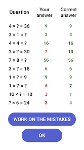 After each training or test, you have the opportunity to see which questions have been answered correctly and which have not. This will help next time to improve the result and remember your times tables at home in an easy, stepbystep way.