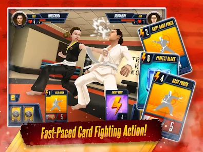 Battle oneonone with friends and foes alike or play offline to hone your skills and improve your rank! Build decks for each fighter to enhance their specific skills, earn rare cards and new moves to perform epic combos, and play wild cards to change the game in brand new ways. Cobra Kai: Card Fighter puts you in control of your favorite characters from the series in an exciting new way that’s loaded with nonstop action and strategy!