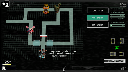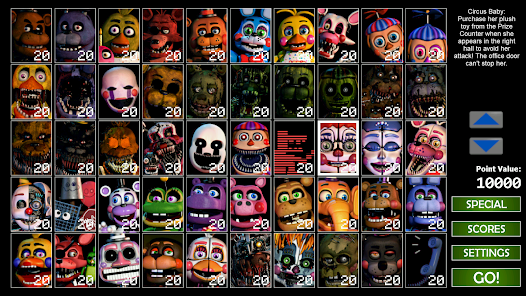 Welcome to the ultimate FNaF mashup, where you will once again be trapped alone in an office fending off killer animatronics! Featuring 50 selectable animatronic characters spanning seven Five Nights at Freddy's games, the options for customization are nearly endless. Mix and match any assortment of characters that you like, set their difficulty from 020, then jump right into the action! From your office desk, you will need to manage two side doors, two vents, as well as two air hoses, all of which lead directly into your office.