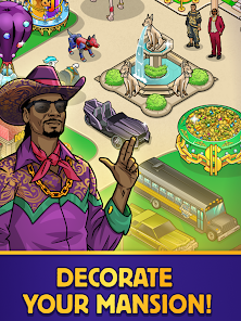 Reap the rewards of having your mind on your money, and your money on your mind. Build and customize Snoop’s tricked out mansion with extravagant decor. From a wine fountain, to custom chopped rides, to a gold throne, Snoop has it all! After all, what’s the point of building an empire without a few perks?