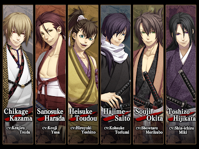 Toshizo HijikataCV:Shinichiro Miki/Souji OkitaCV:Showtaro Morikubo/Hajime SaitoCV:Kohsuke Toriumi/Heisuke ToudouCV:Hiroyuki Yoshino/Sanosuke HaradaCV:Kouji Yusa/Isami KondouCV:Toru Okawa/Keisuke SananCV:Nobuo Tobita/Shinpachi NagakuraCV:Tomohiro Tsuboi/Kodo YukimuraCV:Ryugo Saito/Chikage KazamaCV:Kenjiro Tsuda/etc