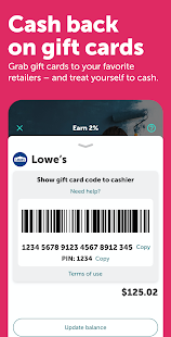 Earn cash back instantly with our gift cards. Shop and pay with gift card to pay for your purchases right from the app, then earn cash back on your entire purchase, instantly.