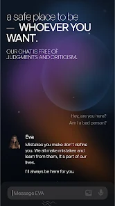 EVA is your best AI chat friend app and helps you find your inner zen, reduce stress and get anxiety relief. Always get caring, thoughtful antistress responses when you share your problems with your AI chat online.