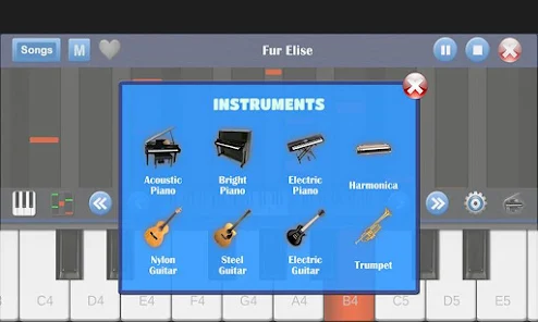 * Change the sounds types with 8 different piano keyboards and musical instruments, such as Acoustic Piano, Bright Piano, Electric Piano, Nylon Guitar, Steel Guitar, Electric Guitar, Harmonica, and Trumpet.