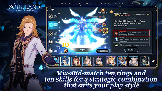 Officially authorized by the creators of the Soul Land anime and novel, Soul Land: Advent of the Gods is a realtime card battle RPG, allowing players to mixandmatch Spirit Rings and Spirit Skills to develop their very own battle styles and awaken their own War Spirits. The exquisite environments are brought to life by the stylish Toon Shading graphics. The game has no VIP system and features an amazing SSR drop rate of up to 10%, so you can easily collect all your favorite cards. The gods of war descend once again, to aid you on your journey to deification!
