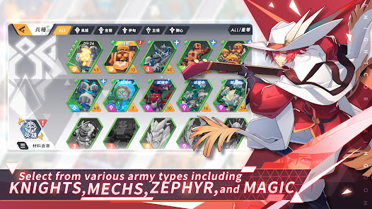 Knightcore Kingdom has a diverse collection of army types, e.g. the Lancelot army type that goes by the traditional codes of chivalry, the mechanical soldiers from Gille that are known for their technologies, and even the magicsavvy soldiers from the secret forest outside of Eden along with the Lionheart soldiers. These battle units each have their own abilities that they are good at. It's up to the players to learn about the different compositions and make the strongest Legion ever.
