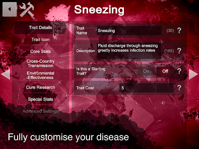 ● Disease lab: Develop a bespoke plague with unique stats and fully customised symptoms, abilities and transmissions.