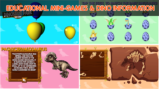 Mini games including balloon pop, fossil bones puzzles and Match the baby dino eggs.