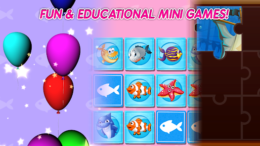 Play one of the fun educational mini games, like Fish Puzzles, Memory Match Cards, or Balloon pop, Go to your catch to see all the fish you have caught. or jump straight in and go fishing. so easy a baby can pick up and play.