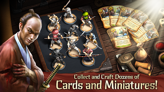 Warbands:Bushido is a miniatures board game online arena with cards, miniatures, dice (i.e. dice random involved) and beautiful terrains to fight on, with both multiplayer battles boardgamers are used to, and challenging singleplayer scenarios.