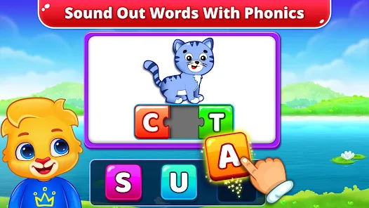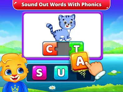 ✔ Spelling: A picture is shown on the screen with letters outlined just above it. Children match the letters at the top by choosing from the tiles below, placing them in the correct order to spell out words. Kids get to learn to spell while learning phonics in the process.