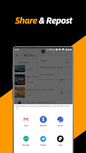 It's also a handy file manager for your downloaded videos and files. With the userfriendly UI and clear design, you can easily download, manage, repost, play, share, and delete all your video files within the video downloader & video saver. Save and download your favorite videos on your Android device and enjoy them anywhere and anytime. The best tool to back up your social media content and share it with your fans and friends. You can also change light and dark themes, manage your video download location, and... so much more awaiting you to explore.