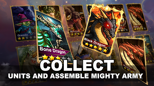 Recruit various heroes from might and magic. Collect, train and upgrade over 50+ creatures: Knights, Dragons, Beholder, Griffin, Medusa and many more.