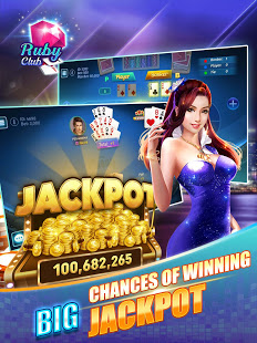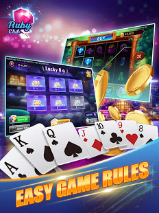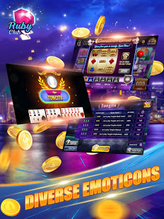 Ang Ruby Club Slots, Tongits, Sabong ay isang koleksyon ng mga libreng laro ng card sa Pilipinas para sa mga mobile device. Hindi lamang naglalaro ng Tongits ngunit din ng maraming iba pang mga kagiliwgiliw na laro: Slots, Poker, Lucky 9, Sabong, 3 Card Poker, Baccarat, Color Game, Sicbo ... upang makipaglaro sa mga kaibigan, pamilya anumang oras, kahit saan.